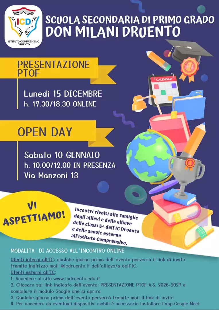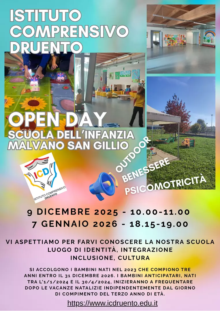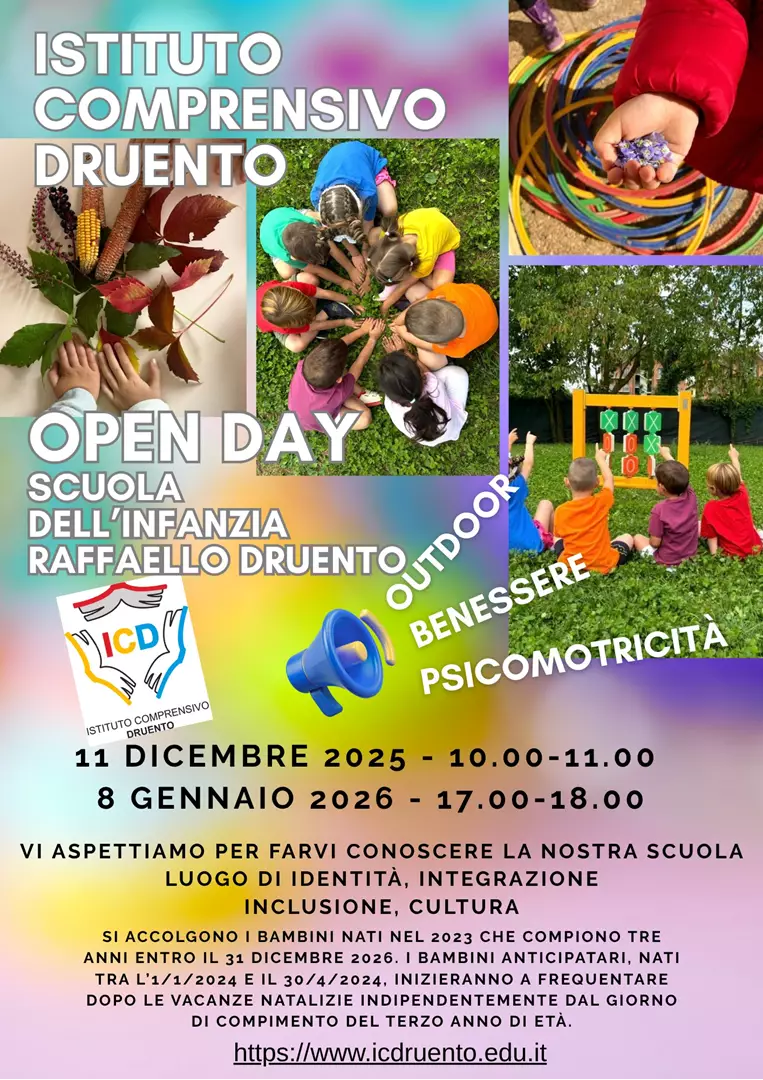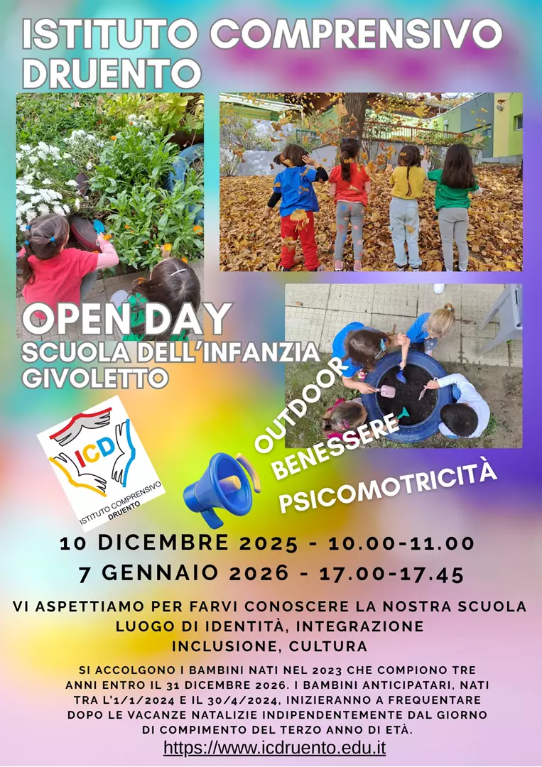 L’Istituto Comprensivo Druento vi invita a scoprire da vicino la propria offerta formativa, caratterizzata da un ambiente accogliente, inclusivo e ricco di opportunità educative. Le nostre scuole sono pensate come luoghi di identità, integrazione, inclusione e cultura dove ogni alunno può crescere in modo armonico, valorizzando i propri talenti.
