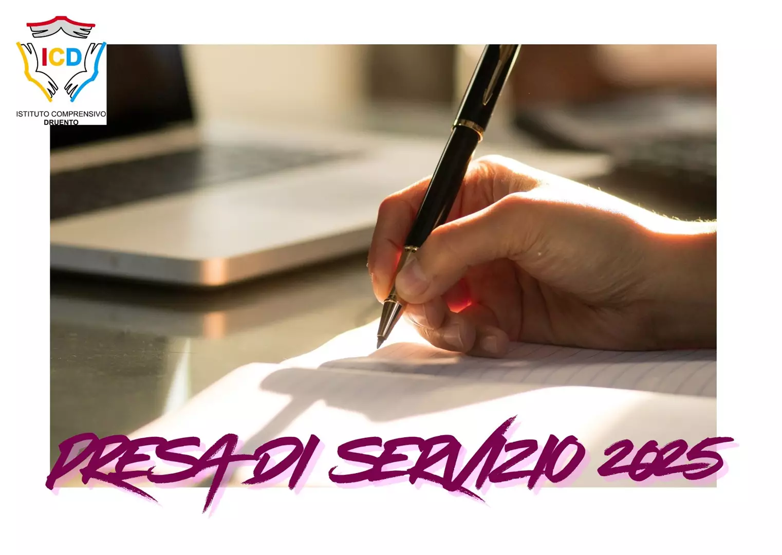 Descrizione La PRESA DI SERVIZIO per neo immessi in ruolo, trasferimenti, supplenze annuali o al termine delle attività scolastiche avverrà in data 1 settembrte 2025 con la seguente scansione oraria: 8.00-9.00 Personale ATA, docenti scuola dell'infanzia e primaria 9.00-9.45 docenti scuola secondaria presso gli Uffici di Segreteria della sede Via Manzoni 11 Druento Multimedia Pubblicato: 26.08.2025 - Revisione: 31.08.2025 Eccetto dove diversamente specificato, questo articolo è stato rilasciato sotto Licenza Creative Commons Attribuzione 4.0 Italia.