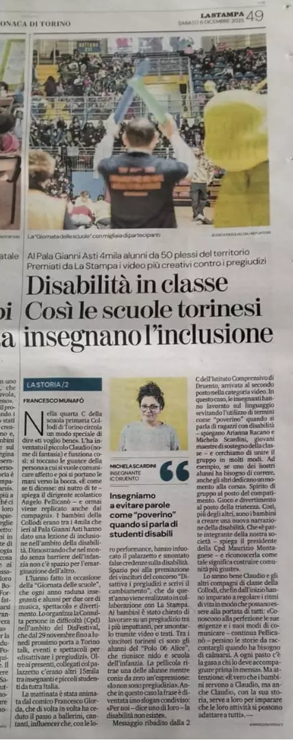 Descrizione Il 5 dicembre 2025 l' Istituto Comprensivo Druento ha partecipato al #DisFestival di Torino organizzato dal CPD - Consulta per le persone con disabilità. È stata una giornata indimenticabile per le bambine e i bambini della classe 2C della scuola Primaria Anna Frank di Druento che, con il cortometraggio Missione Anti Poverino, hanno vinto il secondo posto del Concorso Giornalistico Nazionale Disattiva i pregiudizi e scrivi il cambiamento, promosso da La Stampa per favorire una maggiore consapevolezza sui pregiudizi legati alla disabilità. Missione Anti Poverino - progetto nato dalle idee dei piccoli autori - affronta l’uso improprio della parola "poverino", spesso rivolta alle persone con disabilità. Attraverso la loro creatività, le bambine e i bambini della 2C hanno voluto trasmettere un messaggio importante e profondo: ogni persona è unica, insostituibile e merita rispetto! A loro e alle/ai loro insegnanti l’IC esprime la più profonda gratitudine! Multimedia Giornata internazionale persone con disabilità FestivalDis Documenti Video Ultima modifica il 10/12/2025 22:48 Pubblicato: 10.12.2025 - Revisione: 10.12.2025 Eccetto dove diversamente specificato, questo articolo è stato rilasciato sotto Licenza Creative Commons Attribuzione 4.0 Italia.
