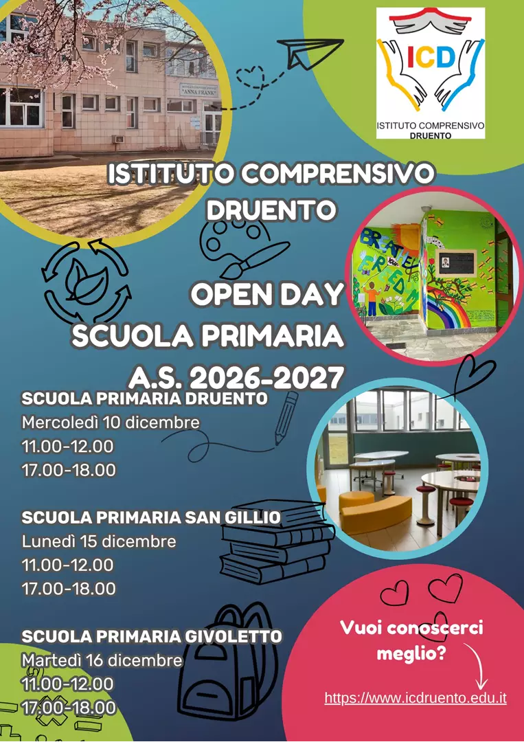 L’Istituto Comprensivo Druento vi invita a scoprire da vicino la propria offerta formativa, caratterizzata da un ambiente accogliente, inclusivo e ricco di opportunità educative. Le nostre scuole sono pensate come luoghi di identità, integrazione, inclusione e cultura dove ogni alunno può crescere in modo armonico, valorizzando i propri talenti.