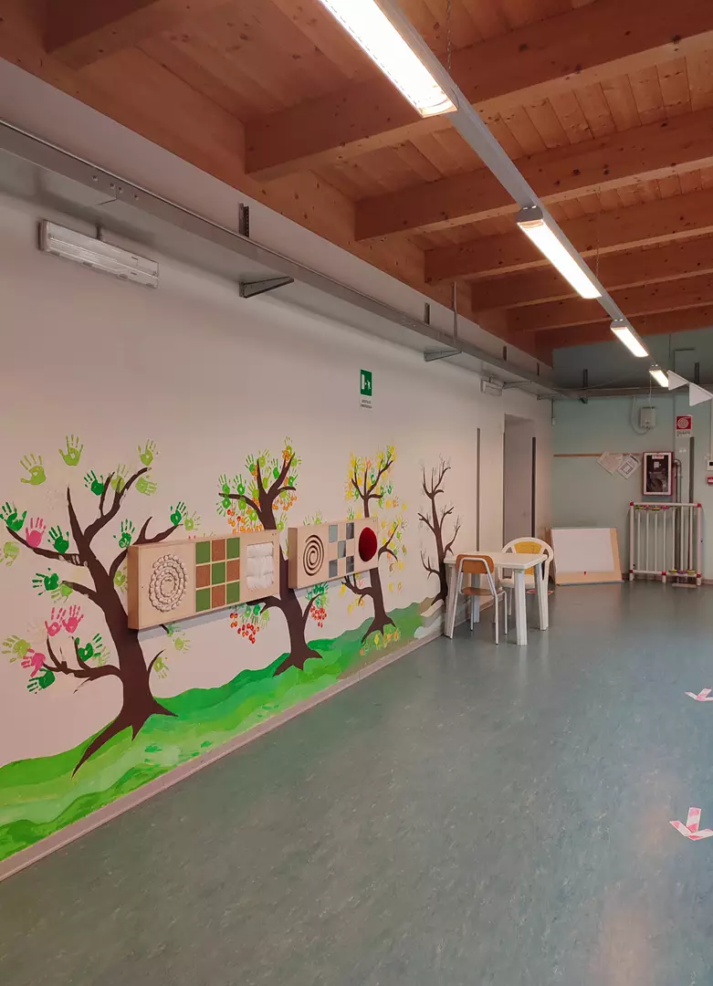Quattro aule con laboratori e servizi igienici annessi. Ampi saloni con 3 monitor touch, ampia area esterna attrezzata.